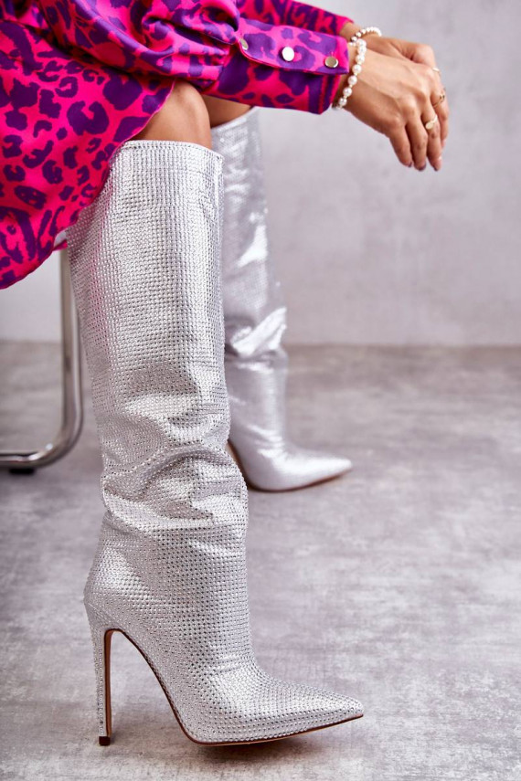 Moekad pika säärega saapad kõrge jämeda kontsaga säravate kristallidega Hõbedat värvi Lovisa