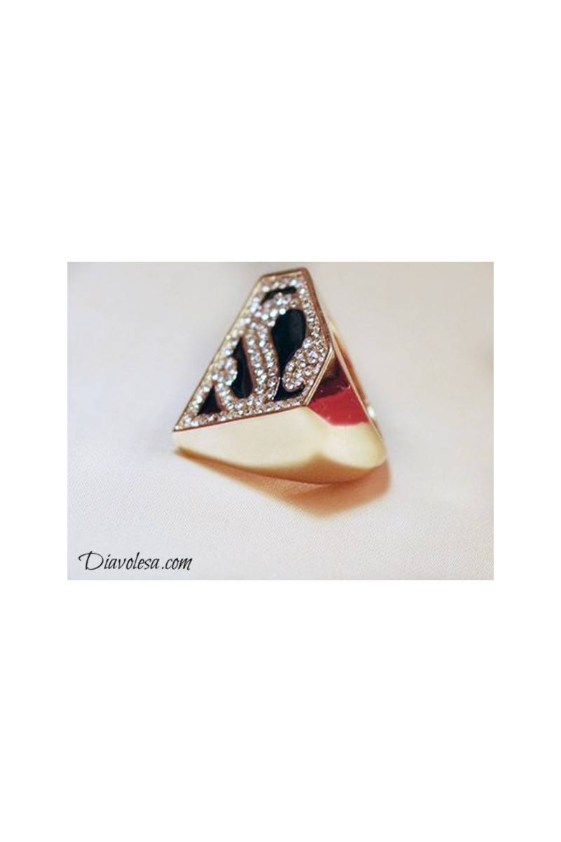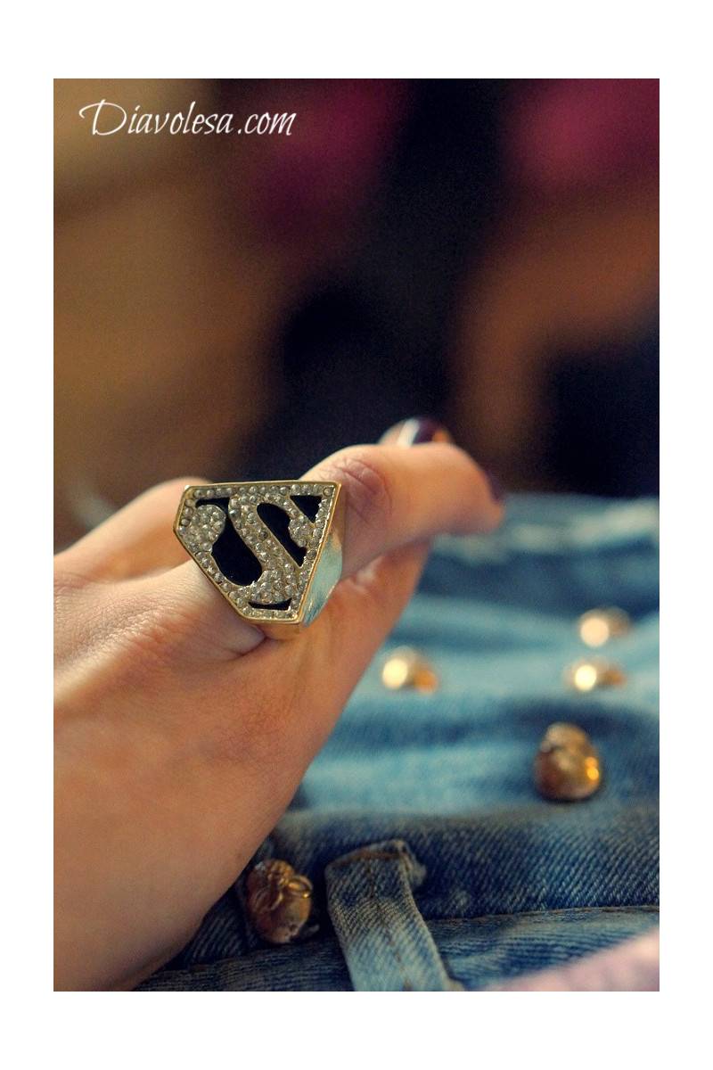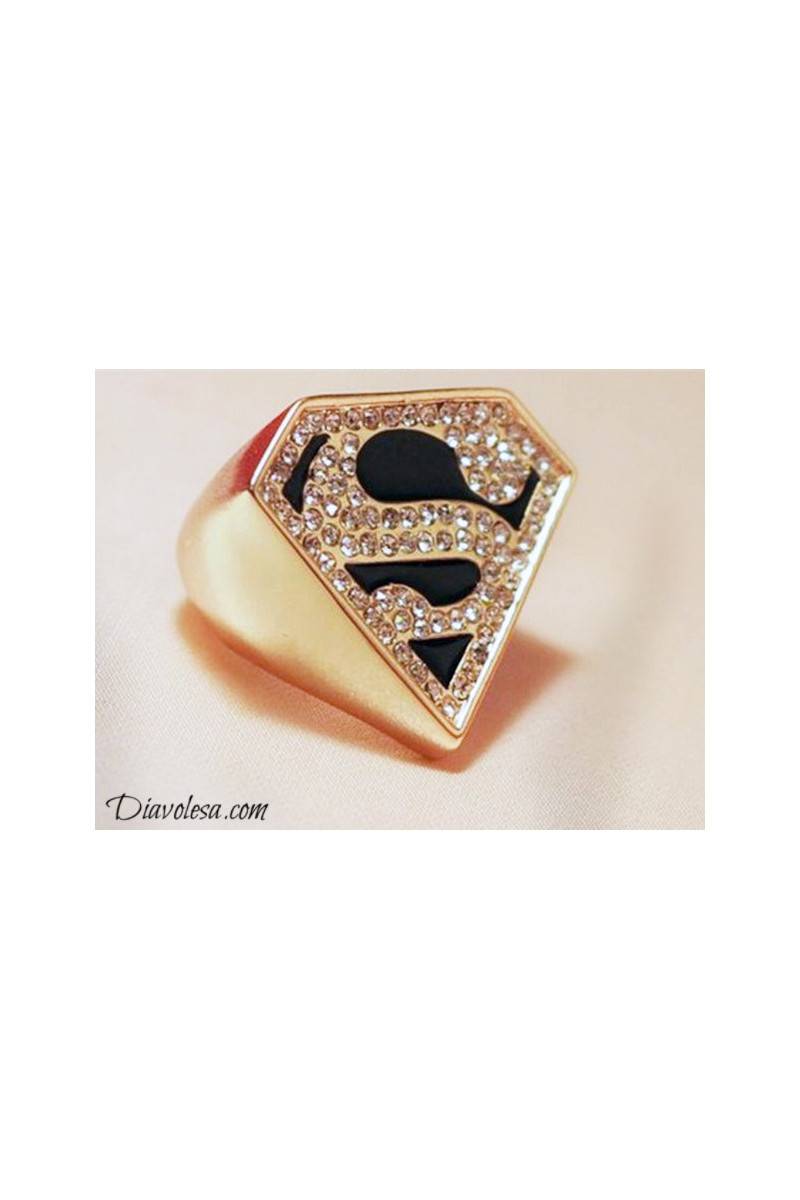 Įspūdingas žiedas su legendinio komiksų ir filmų herojaus - Supermeno - ženklu, kuriame pavaizduota "S" raidė. Žiedas yra aukso spalvos, dekoruotas tviskančiomis akutėmis, pagamintas iš metalo - aliuminio. Žiedo skersmuo apie 1,7 cm. "S" ilgis - 2,7 cm, plotis - 3 cm.