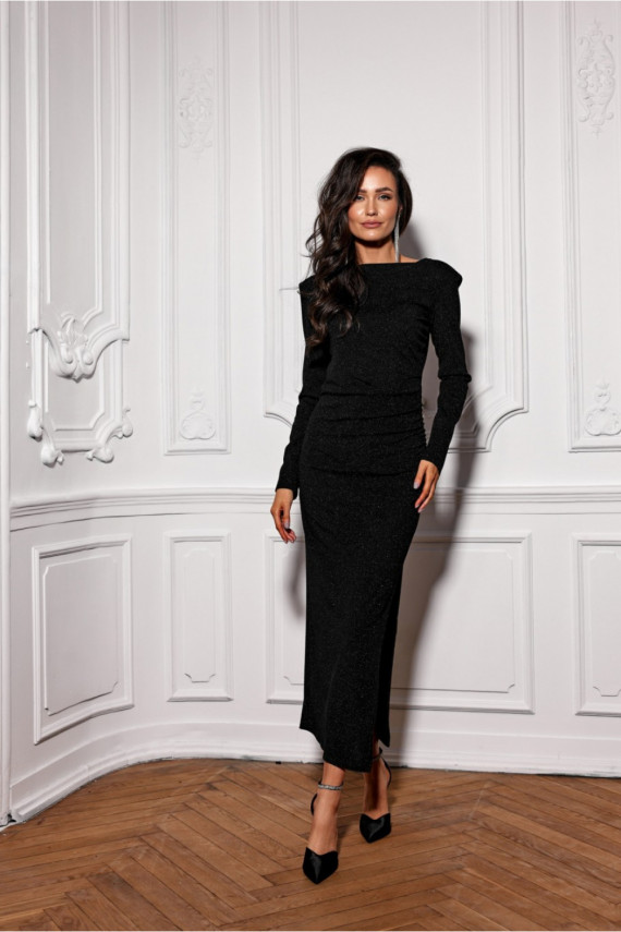 Kleit on valmistatud läikivate aktsentidega materjalist, mis valguses kaunilt säravad. Elegantne paadikaelus rõhutab peenelt õlajoont, andes tervikule sensuaalse iseloomu. V-kujuline kaelus kleidi tagaosas lisab sellele erilise võlu ja naiselikkuse. Silmatorkav säärepilu on võtmeelement, mis mitte ainult ei kalluta siluetti, vaid tagab ka mugavuse kandmisel. Küljel olev kõverdus rõhutab delikaatselt puusade kuju. Õlapadjad lisavad kleidile modernsust ja struktuuri, sulandudes ideaalselt moesuundadega, tõstes samal ajal õlgu esile. Kleit on elastne ja sobib ideaalselt siluetiga, kallistades naiselikke kumerusi. Olenemata sellest, kas plaanite linnaõhtut või elegantset pidu, saab sellest kleidist teie lemmik garderoobitükk. Seda on lihtne stiilida, kombineerida elegantsete kontsakingade ja ehetega või leida vabaaja välimus koos poolsaabaste ja väikese kettkotiga, et stiili murda. Toode on valmistatud ja õmmeldud Poolas.