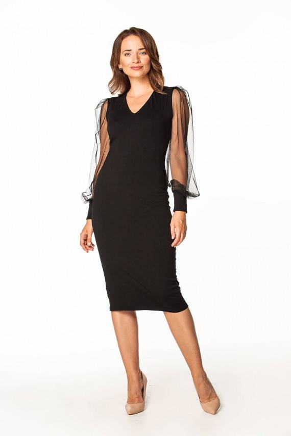 Elegant knee-length midi Kleit with a pointed neckline. Made of cotton knit Materjal: with tulle sleeves finished with a ribbed hem.