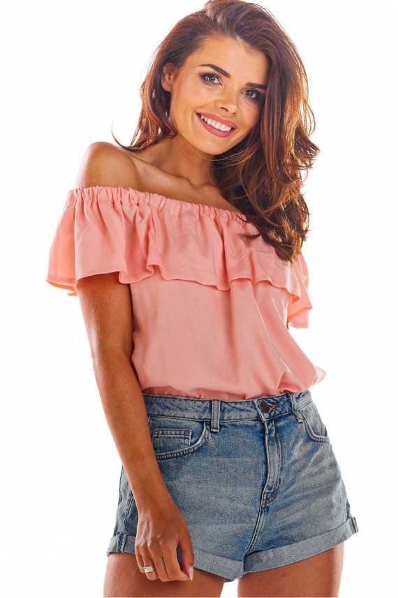 Pluus with open shoulders in trapeze cut in juicy summer colors. The neckline on an elastic band beautifully exposes the shoulders. A frill adds lightness. Made of airy and breathable natural viscose. Pluus ideal for summer. The product was manufactured in Poland.