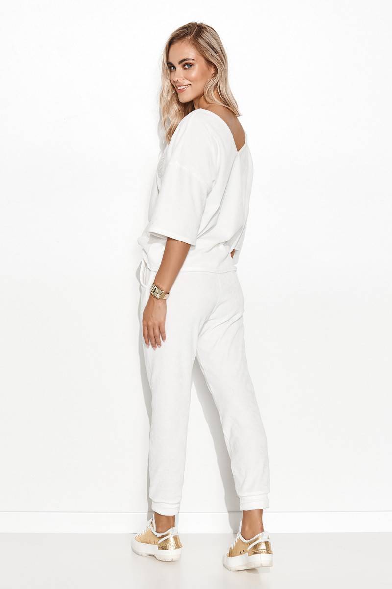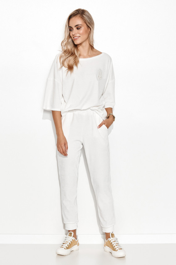 Interesting and very comfortable velour women's set with long pants, available in: blue, cream, mint, beige, black, lilac, orange. The blouse from the set has a deep neckline, which is rounded at the front and slightly shorter than at the back. The neckline on the back draws an inverted triangle shape. The blouse is loose-fitting. It has short sleeves. A decorative application is sewn on the front. Pants are classic with a long leg finished with a welt. On the waist line there is a thick rubber band thanks to which the pants fit the figure beautifully and emphasize feminine shapes. In addition, pants have side slid pockets. The set looks very elegant. Can be successfully worn with stiletto shoes and sports shoes.