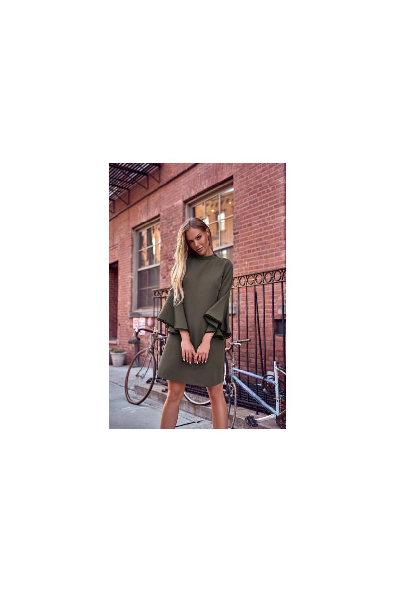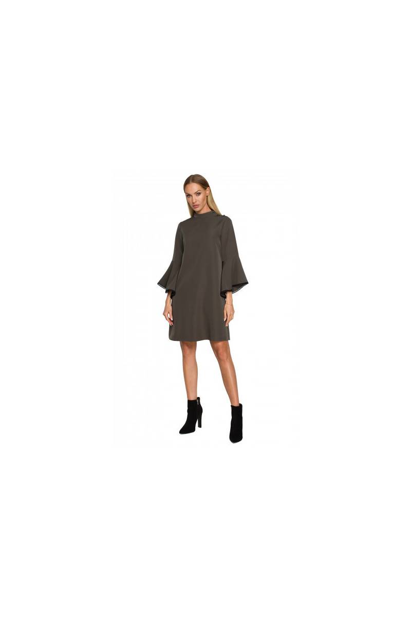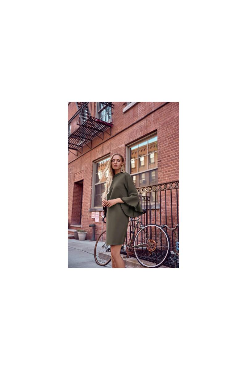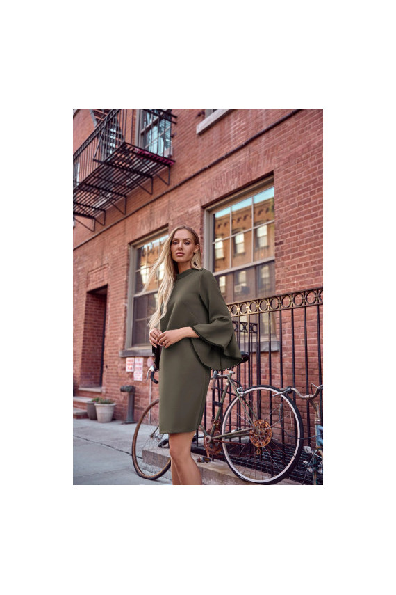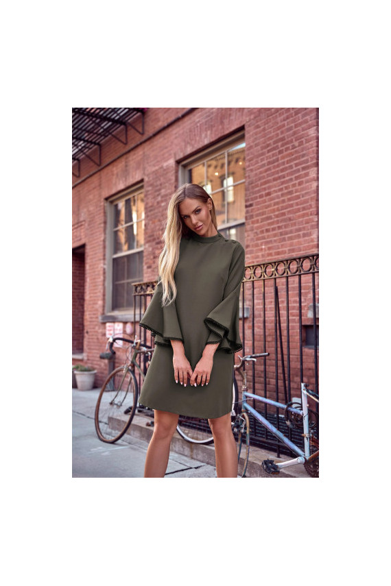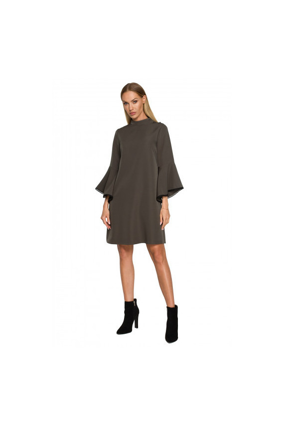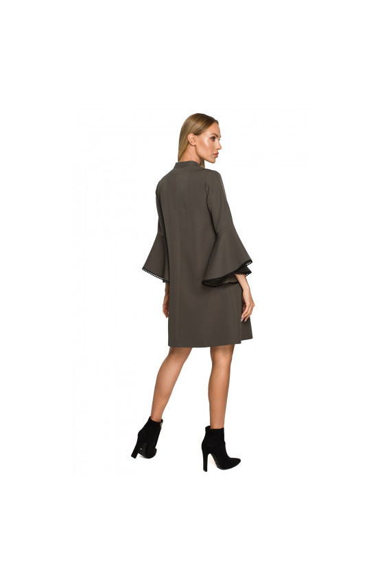 A Kleit with a trapezoidal or otherwise A-line cut not only adds girlish charm, but also helps to cover up the shortcomings of the figure. We still took care of the details that make it unique, the wide, ruffled sleeves were decorated with a delicate ribbon with spherical piping. The Kleit is unlined.