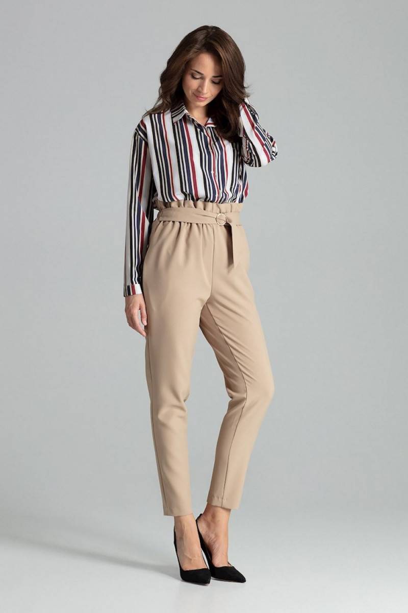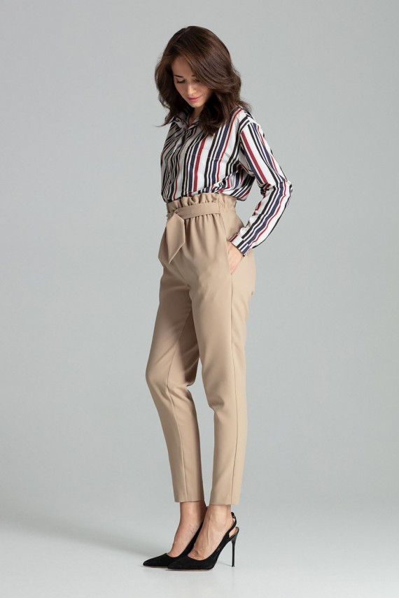 Beige long pants, slightly tapered to the bottom. Vööümbermõõtband creased and sewn-in rubber band with a width of 3 cm. Vöö with decorative metal buckle in golden color. Pockets at side seams.