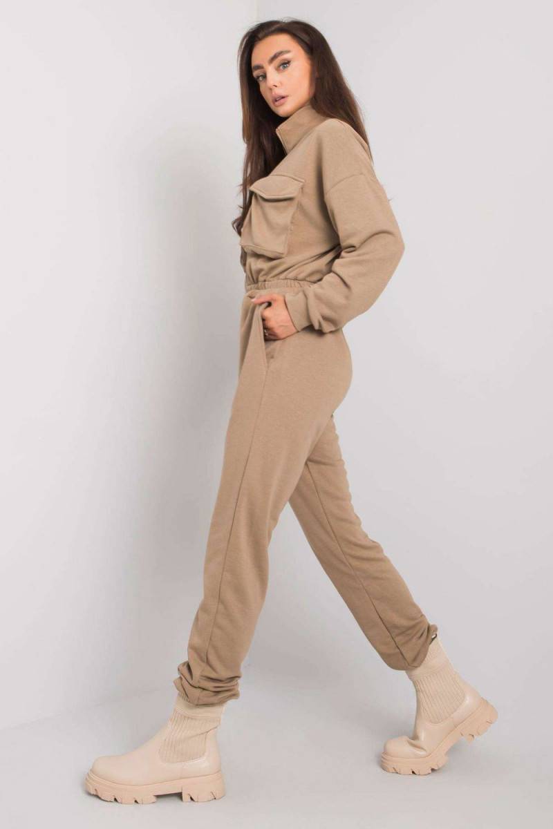 Dark beige cotton zip-up jumpsuit. Perfect for everyday wear.