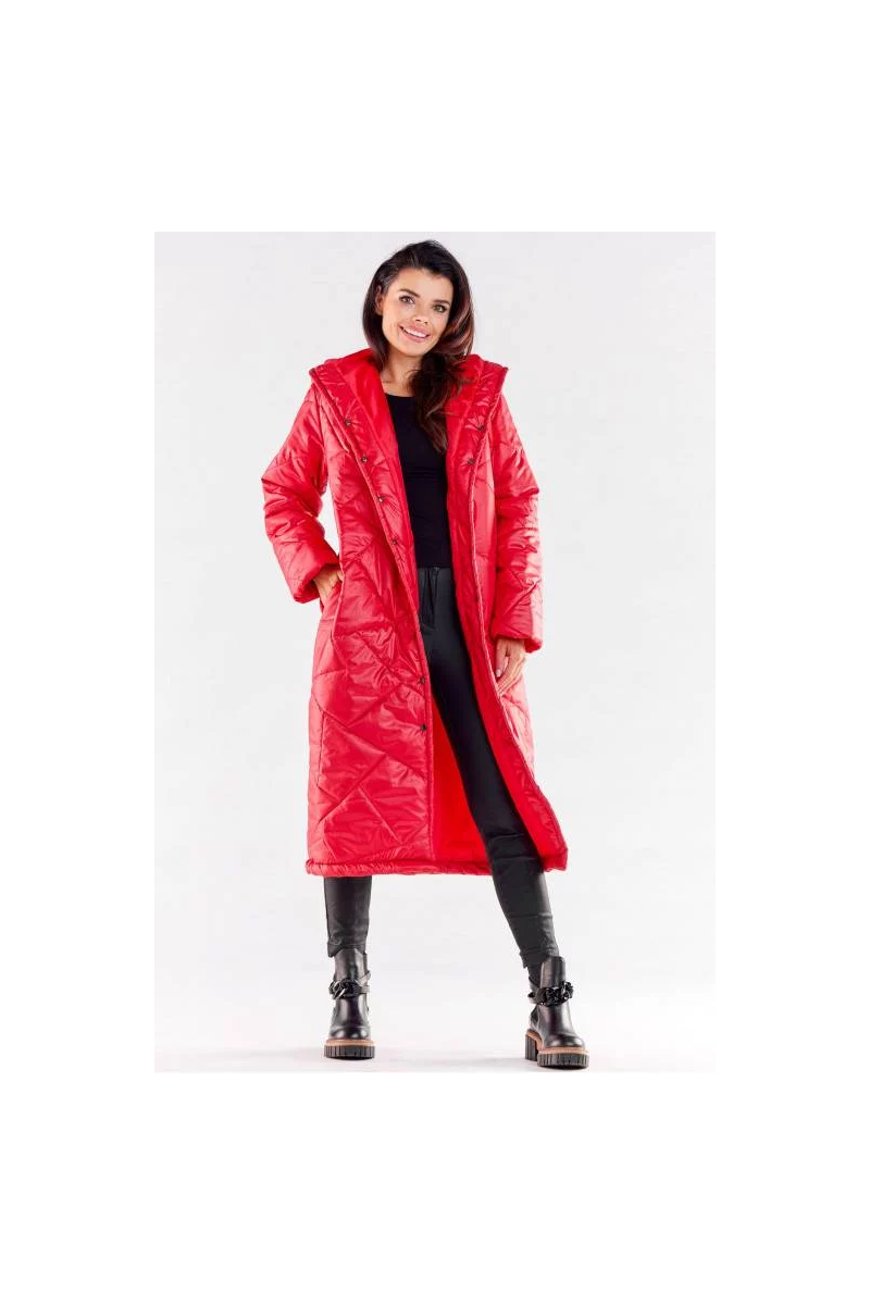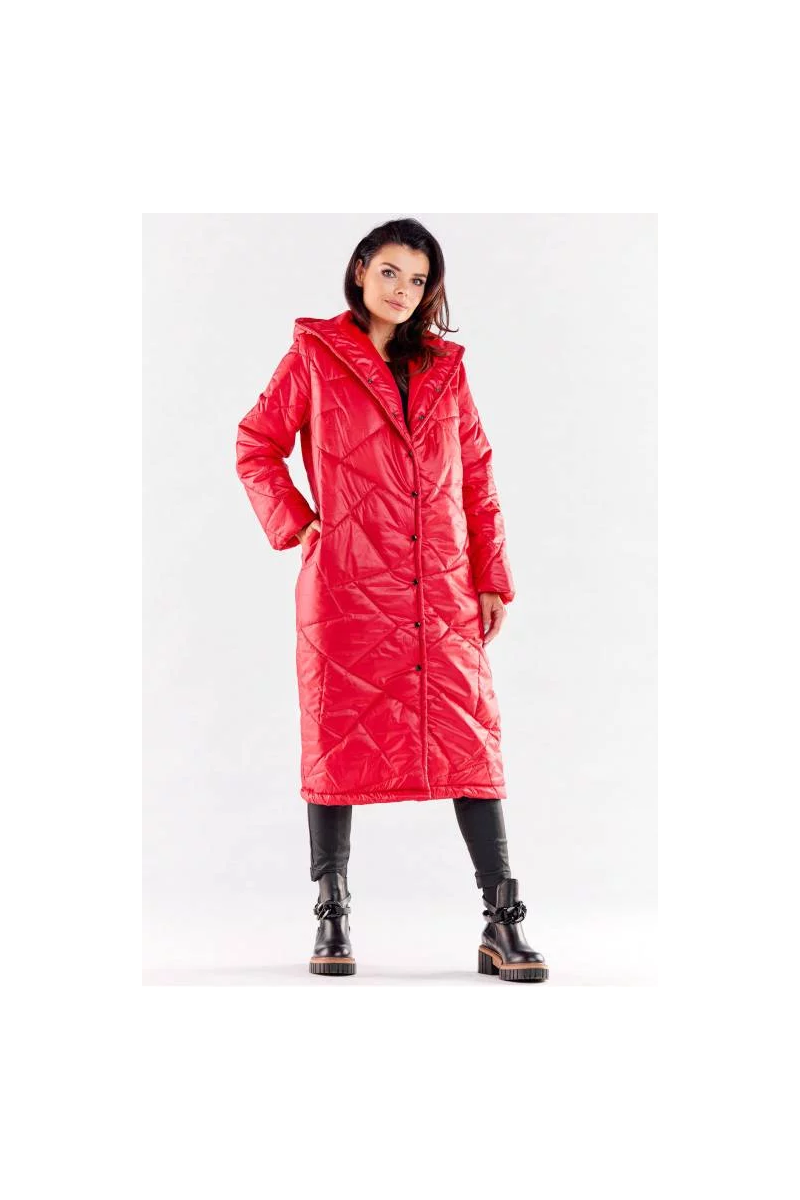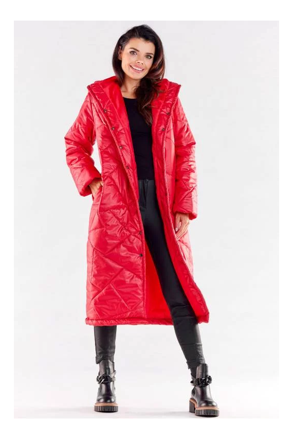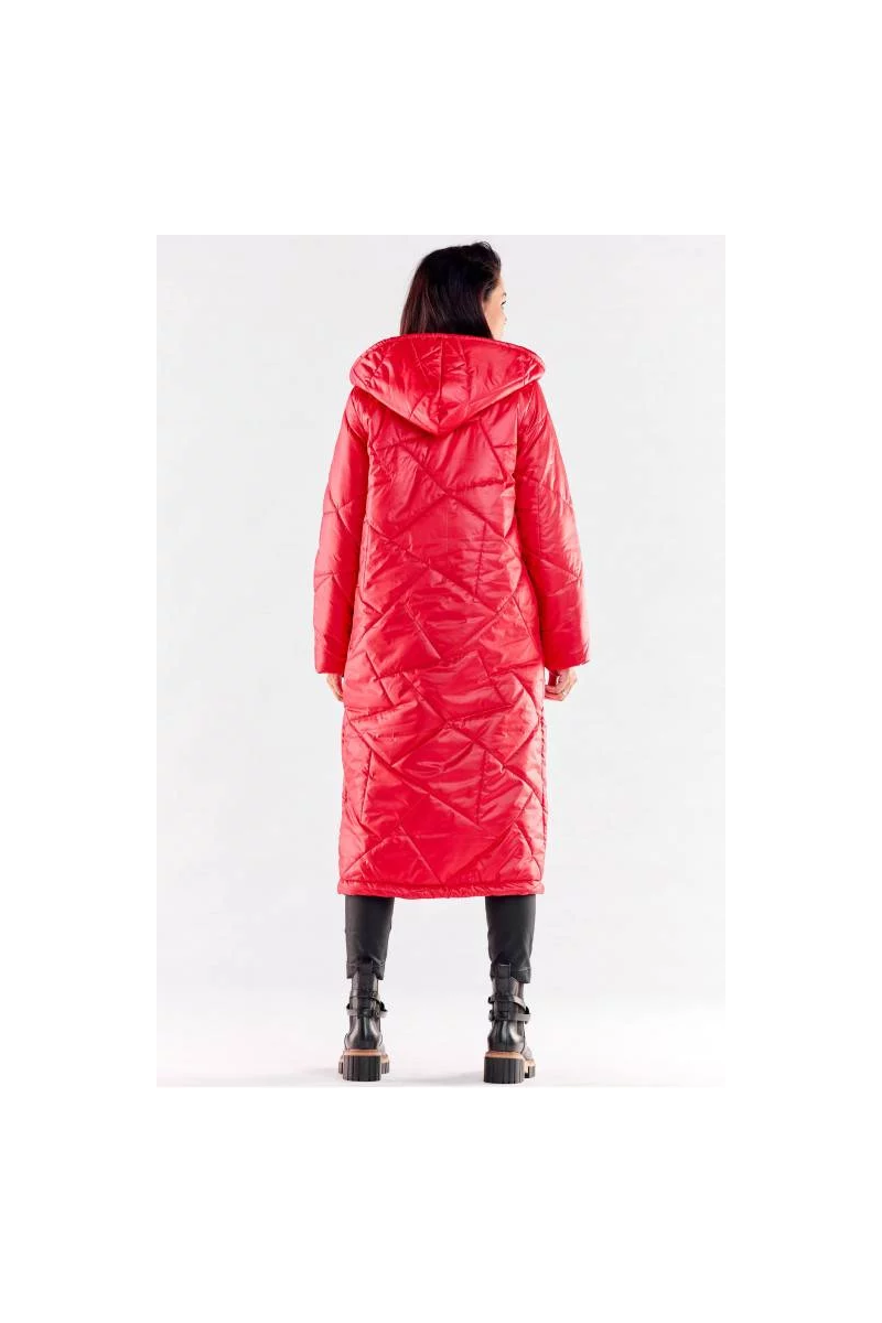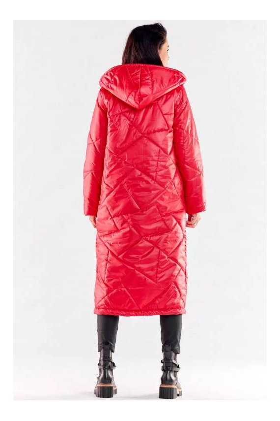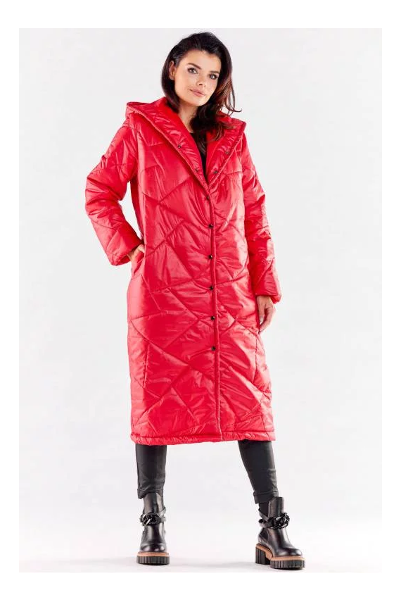 Long quilted coat with pockets, fastened with press studs. It has a large hood, which can protect against rain and wind. It will be perfect for cool autumn evenings and winter chills. Thanks to this season's very fashionable length, you can create many original outfits with this coat. The coat is fully lined.