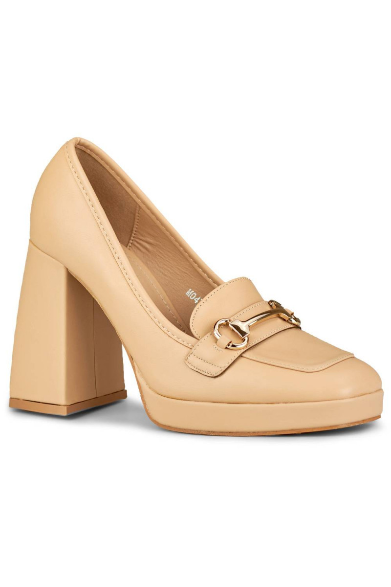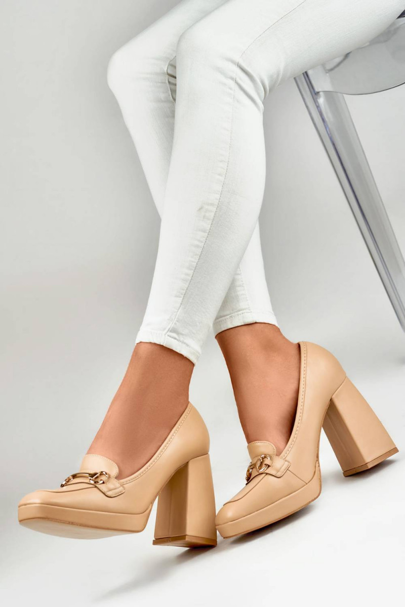 The fashionable pumps are planted on a massive heel in the form of a higher block and a delicate platform. They were made of eco leather. In addition, they have a strap with a decoration on the front. These pumps have a stiffened heel counter. The soft insole is also made of eco leather. This should find a place in your closet!