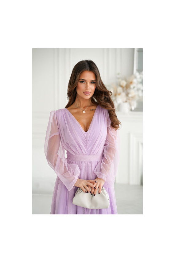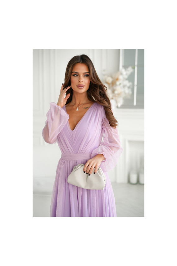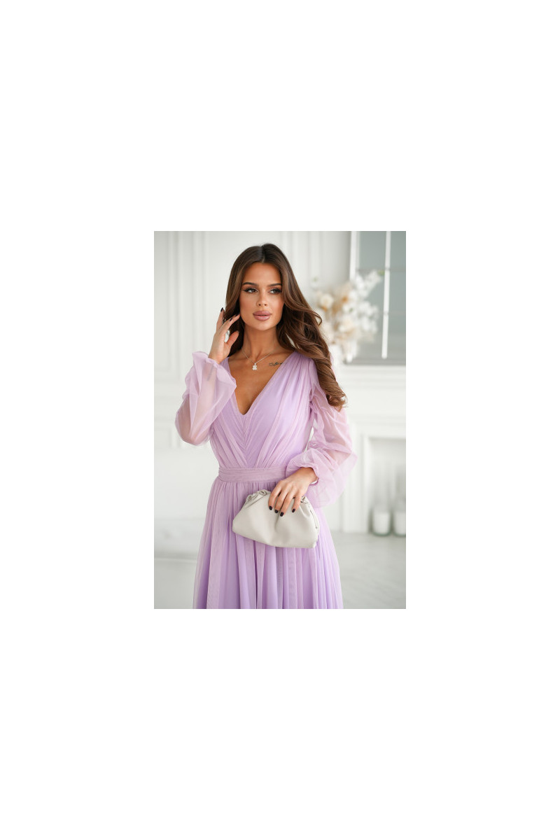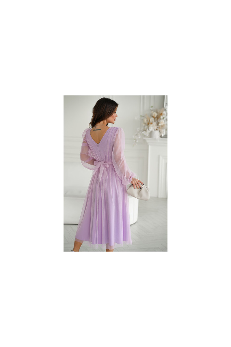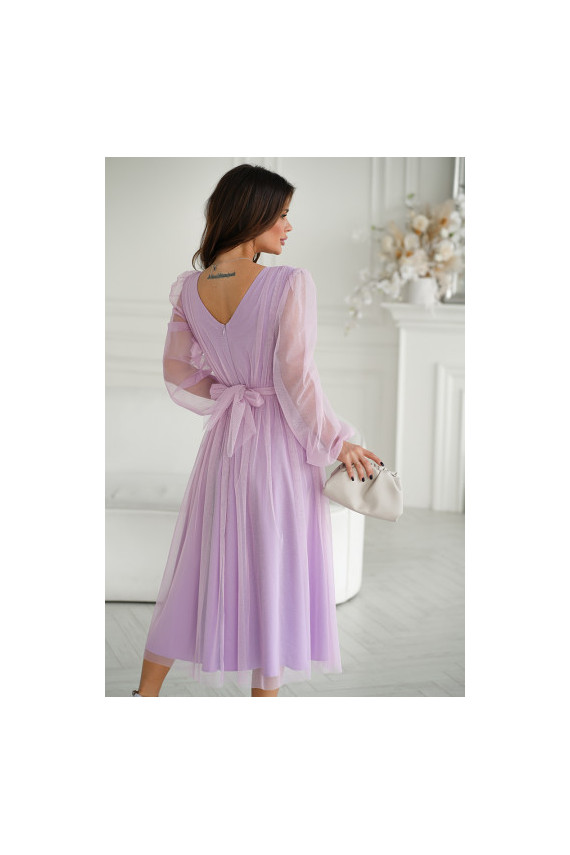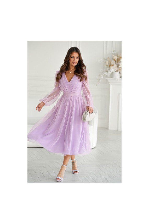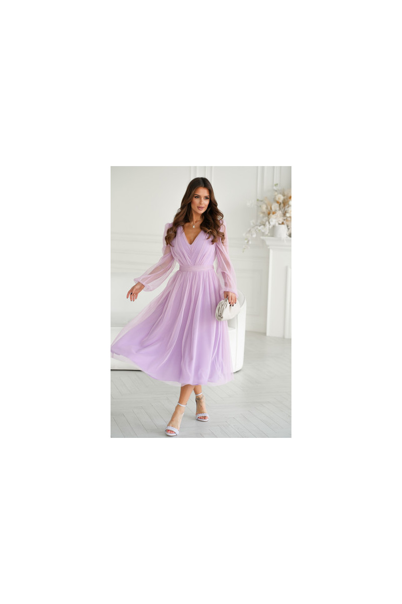 Midikleit kergelt laieneva kihilise seelikuga, mis on kaunistatud brokaatvõrguga. Loomingu ülaosa on kortsus pikkade varrukatega, mis on viimistletud kummiga. Varrukad on õmmeldud ülejäänud kleidiga samast võrgust. Kleit on voodriga ja kinnitub kaetud lukvered zipper. Cheese-shaped neckline and back. Stiilsedl adding chic and femininity.